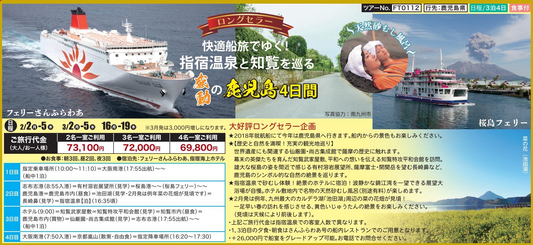 | ツアー名 | 【FT0112】ロングセラー!快適船旅でゆく!指宿温泉と知覧を巡る感動の鹿児島4日間 |