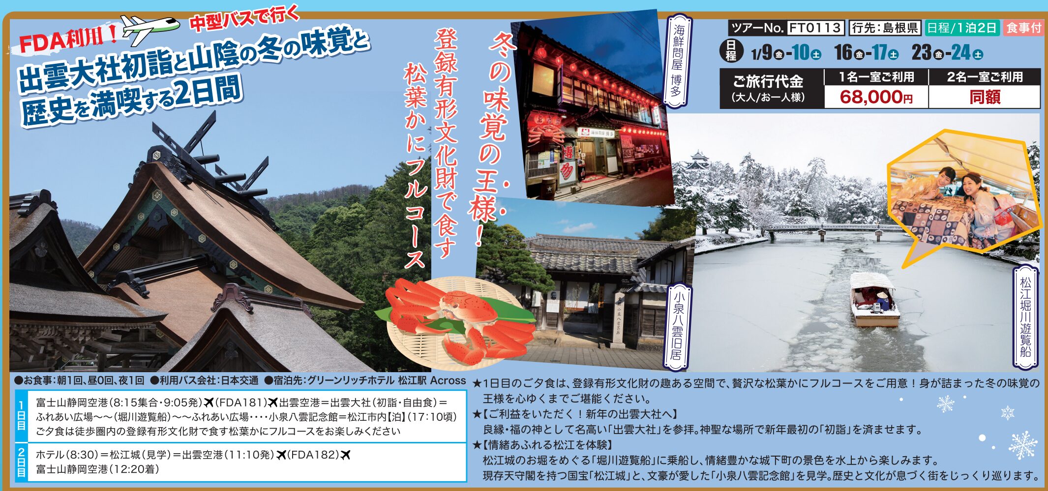 ツアー名【FT0113】FDA利用!現地中型バスで行く!出雲大社初詣と山陰の冬の味覚と歴史を満喫する2日間