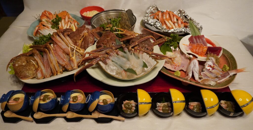 1日目のご夕食は、登録有形文化財の趣ある空間で、贅沢な松葉かにフルコースをご用意!身が詰まった冬の味覚の王様を心ゆくまでご堪能ください。