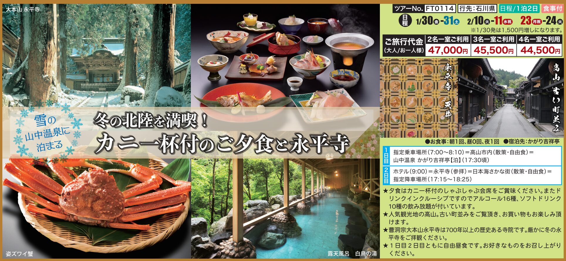 | ツアー名 | 【FT0114】冬の北陸を満喫!カニ一杯付のご夕食と永平寺 |