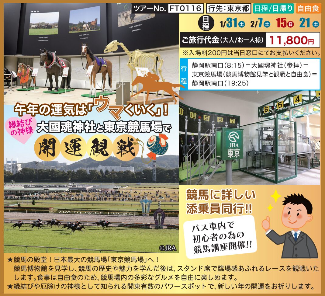 | ツアー名 | 【FT0116】午年の運気は「ウマくいく」!縁結びの神様 大國魂神社と東京競馬場で開運観戦! |