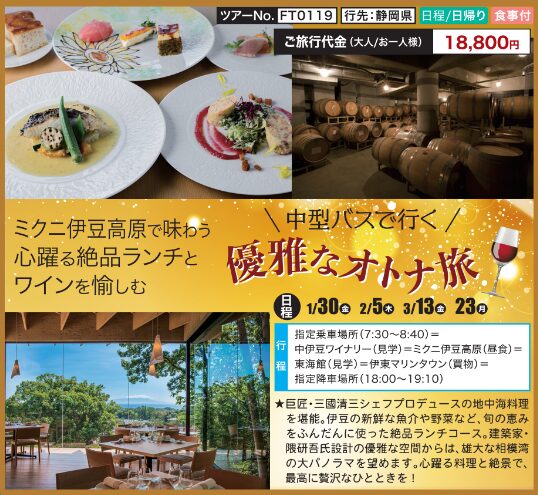 | ツアー名 | 【FT0119】ミクニ伊豆高原で味わう心躍る絶品ランチとワインを楽しむ優雅なオトナ旅 |