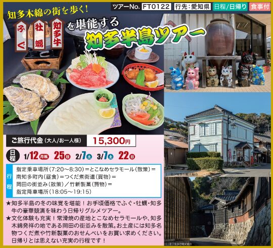 | ツアー名 | 1~3月【FT0122】知多木綿の街を歩く!ふぐ・牡蠣・知多牛を堪能する知多半島ツアー |