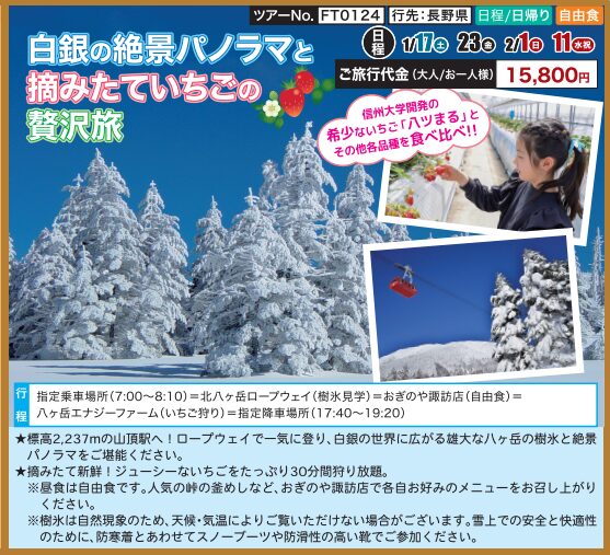 | ツアー名 | 【FT0124】白銀の絶景パノラマと摘みたていちごの贅沢旅 |