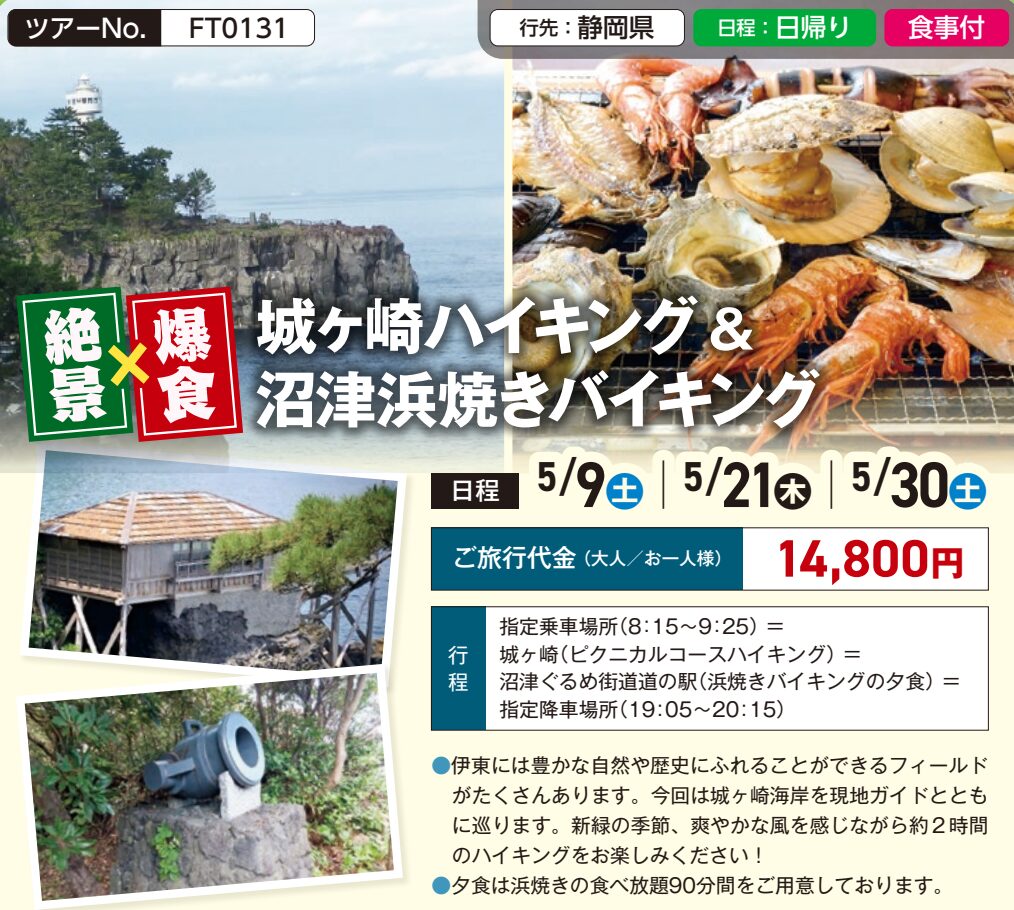 | ツアー名 | 【FT0131】【絶景×爆食】城ヶ崎ハイキング&沼津浜焼きバイキング |