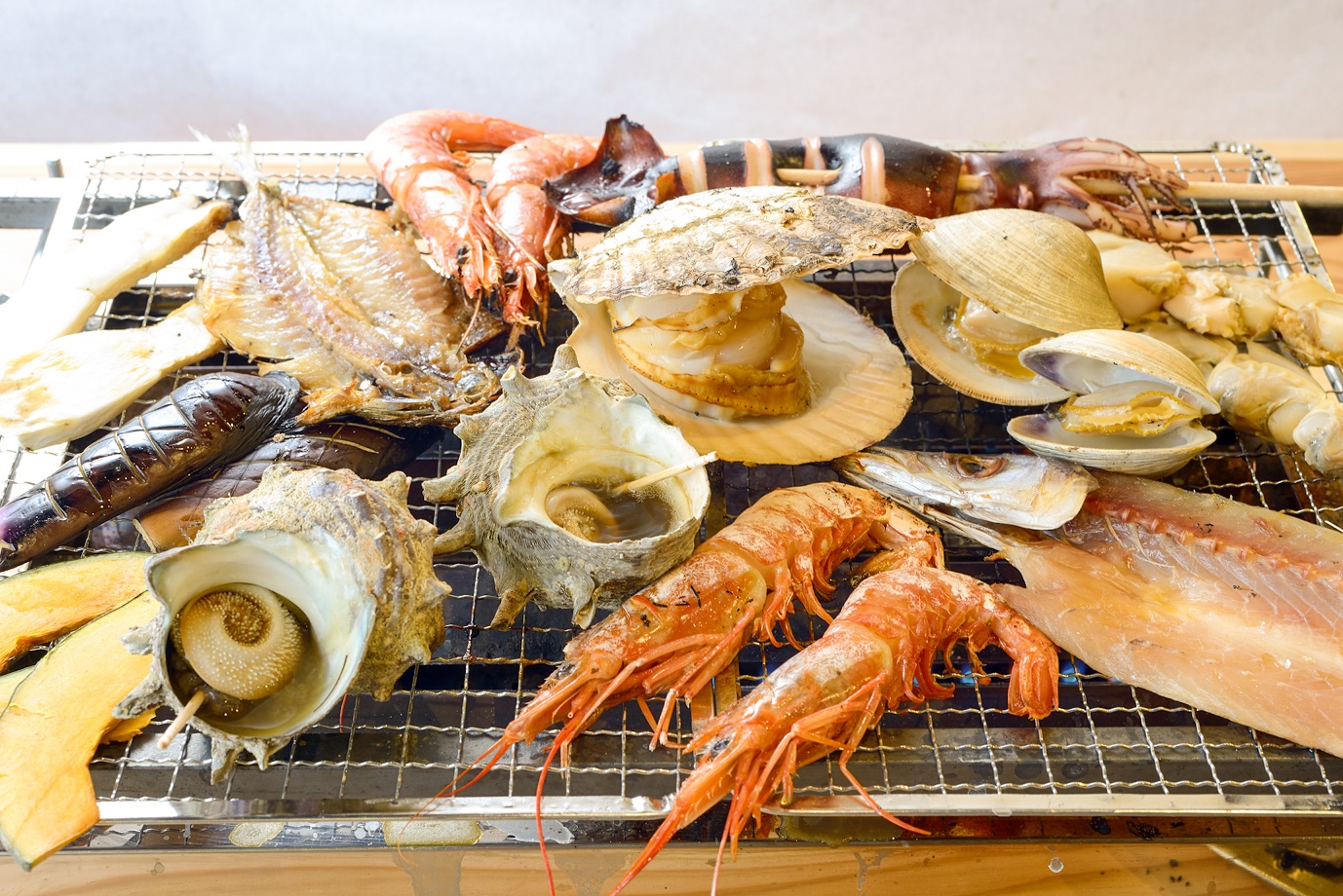 夕食には、海の幸を心ゆくまで堪能できる、豪快な浜焼き食べ放題を約90分間たっぷりご用意。網の上ではじける貝の香ばしい匂いと、新鮮な魚介の旨味が食欲をそそります。絶景を満喫し、お腹も限界まで満たされる、まさに「絶景×爆食」を体現する至福の夕食をお楽しみください。