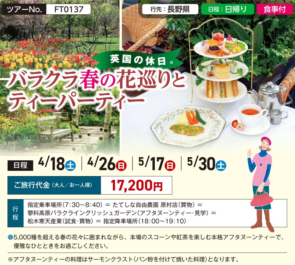 | = 藁科高原バラクライングリッシュガーデン(アフタヌーンティー昼食・見学) | 昼○ | |